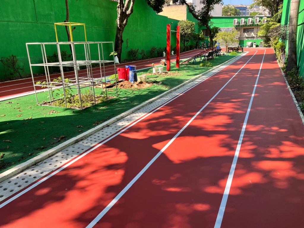 Oferecemos, opcionalmente, a demarcação das raias, com tinta poliuretânica (PU) branca de alta resistência às intempéries, para criar o visual semelhante ao da pista de Atletismo oficial.